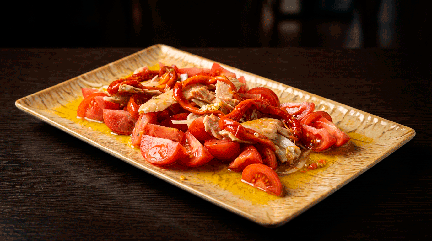 Tomates Raf, bonite du Nord et oignons nouveaux, huile d'olive extra vierge Picual