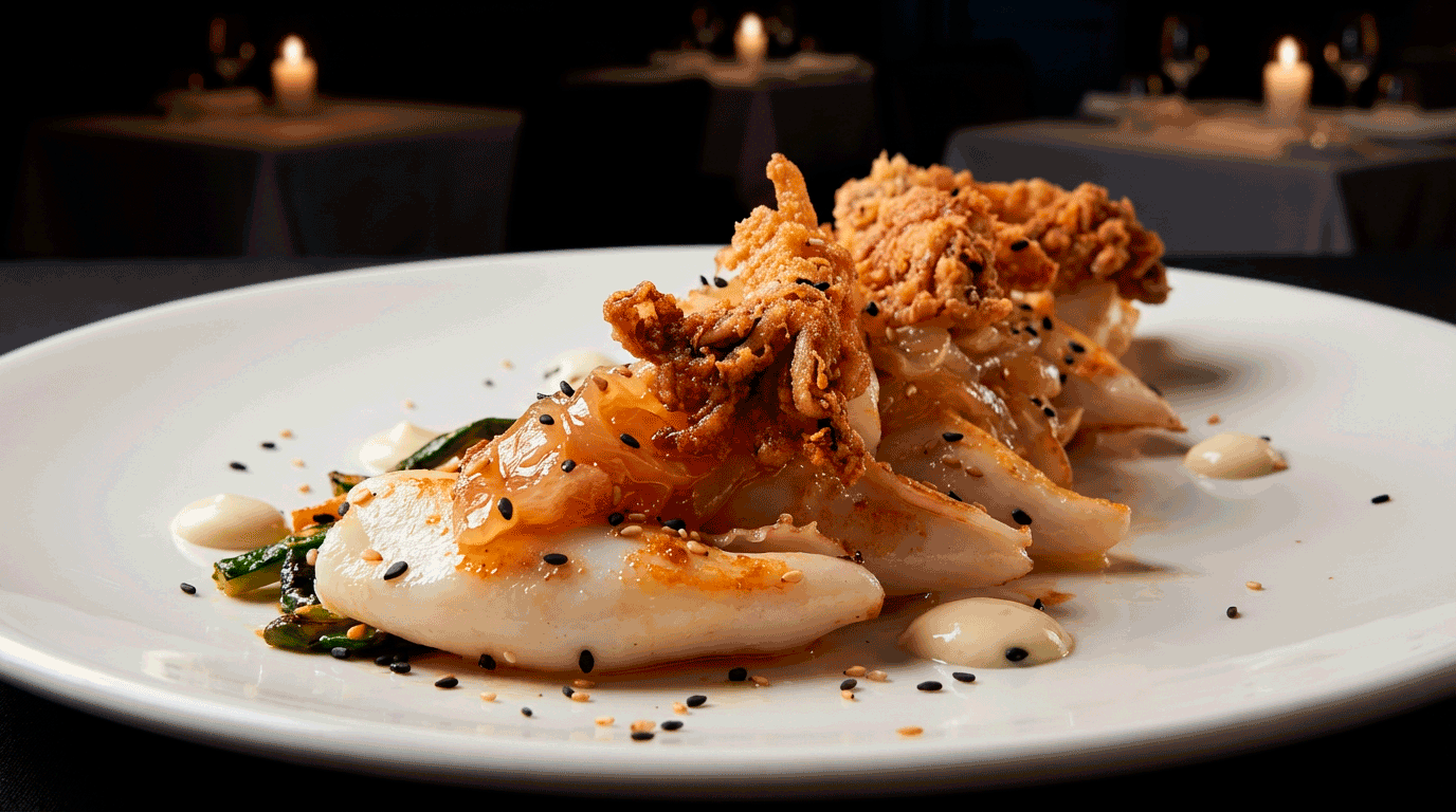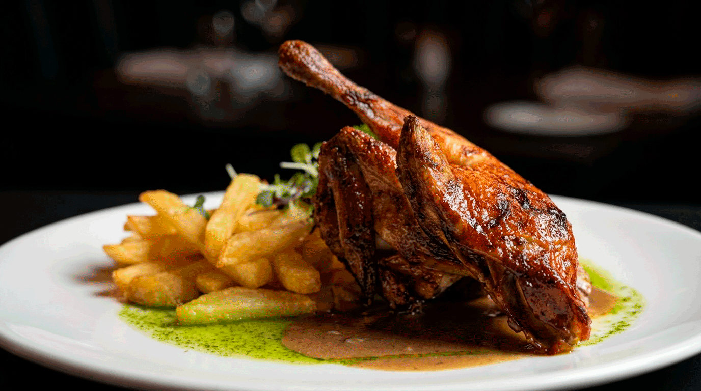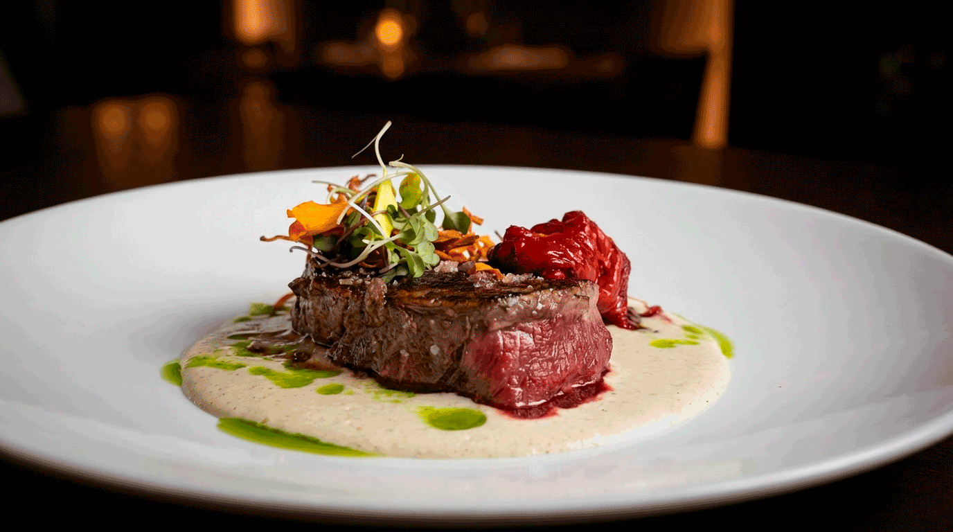 De vaca con salsa demi glace, patatas y pimientos verdes.